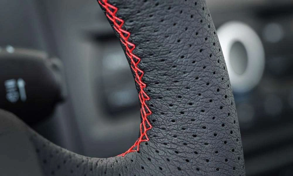 - Отделка руля, чехла КПП кожей с красной отстрочкой
